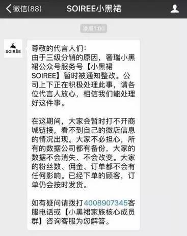 在 2017 年年初, 700 萬粉絲小黑裙因涉嫌三級分銷被封(初創電商品牌SOIREE奢瑞小黑裙),官方隨后發公告進行安撫,通知如下。