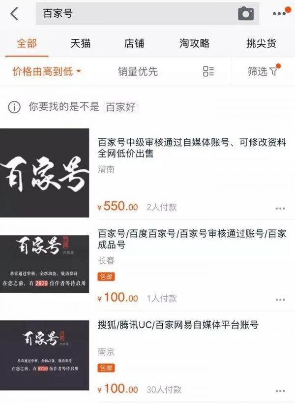 ▲奇貨可居之下,百家號在某寶上被炒到幾百元一個,而且還真的有交易。