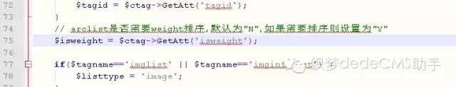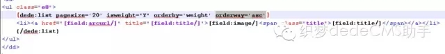7、好的,現在就可以在dede:list標簽中使用權重來排序了,具體調用代碼如下圖: