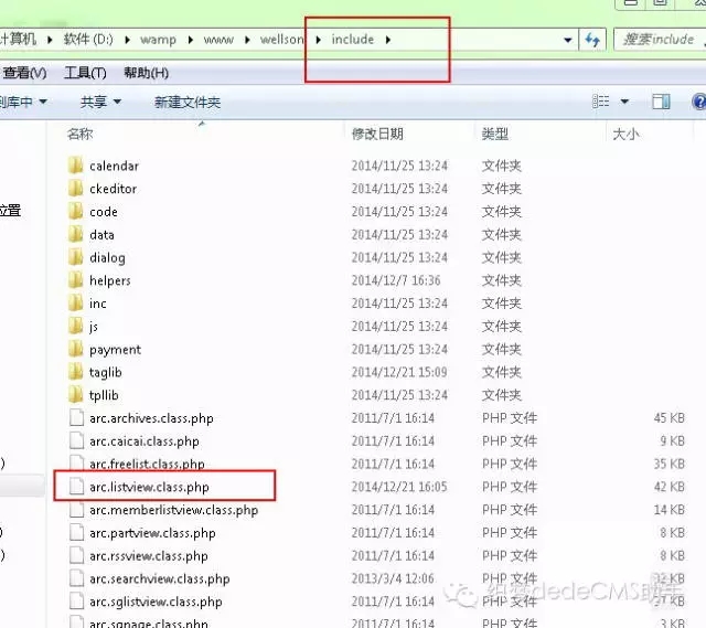 4、好的這樣改了之后dede:arclist中就可以按權重來排序了。但是我們在欄目列表頁使用dede:list還是無法按權限排序。這是因為 dede:list標簽并為加入按weight排序的方法。我們在include下面找到arc.listview.class.php打開