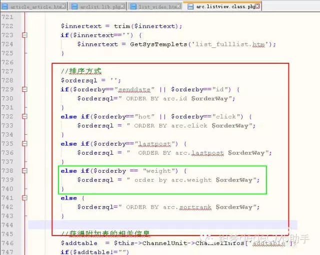 2、但是當我們在dede:arclist標簽中使用orderby='weight'來排序時,發現文章顯示并沒有起作用。我們在include\taglib下找到文件arclist.lib.php 打開來看一下代碼。