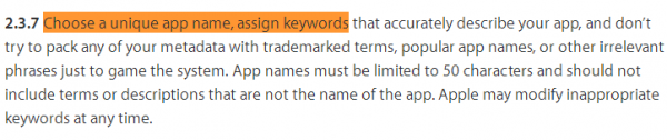 ASO副標(biāo)題不要出現(xiàn)熱門(mén)APP品牌詞,想蹭量的心情可以理解,但蘋(píng)果對(duì)副標(biāo)題的規(guī)定是有明文規(guī)范的,其中堆砌品牌詞與熱門(mén)APP的行為都將引發(fā)一系列后果。有些開(kāi)發(fā)者上架被拒的原因,就有應(yīng)用副標(biāo)題沒(méi)不過(guò)關(guān)的因素。(圖為APPStore官方規(guī)范截圖)
