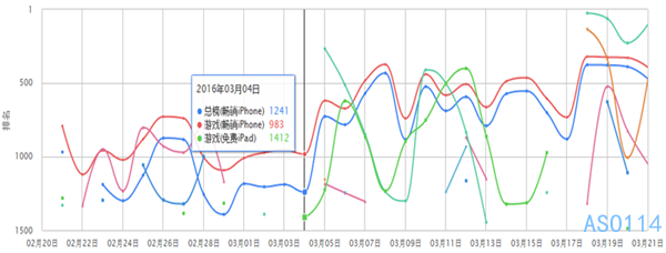 例:根據ASO114優化工具偵測到的某刷榜APP近一個月的表現來看,如果是一款好產品的話,通過刷榜還能維持一段時間,維護周期會在一星期左右.而如果是一款很差的產品來刷榜,那么它的榜單排名往往會極不穩定,能維護三天算幸運,一般一天的時候就會出現波動,如圖: