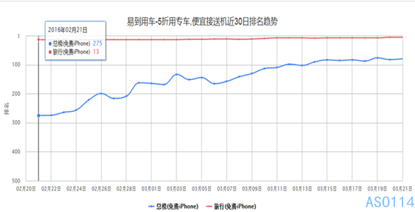 例:近日有一款打車APP在推廣上大燒錢財,用戶下載APP后首次充值0.1元便免費贈送50元的打車卷,邀請一位好友下載APP,還另有提成。在這一波強力推廣面前,此款APP于總榜的變化也是捷捷攀升,一個月內,總榜的排名從275位一路上升到82位。