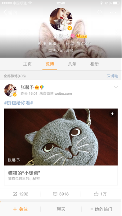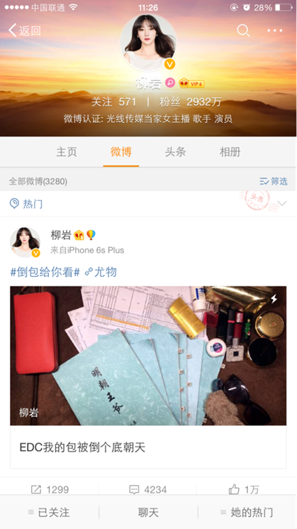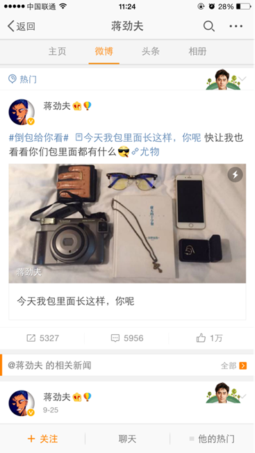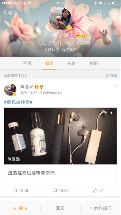 明星們的曬包引發了網友瘋狂的評論和點贊,知道自己的愛豆每天帶什么出門,甚至發現自己帶的和偶像一樣,無疑拉近了明星與粉絲之間的距離,也讓網友自己產生想曬包內物品的沖動,從而讓#倒包給你看#這一話題形成強勢的病毒傳播效果。20位重量級明星領銜#倒包給你看#后,頭條文章閱讀量飆升,其中陳意涵的頭條文章閱讀量高達750W+。